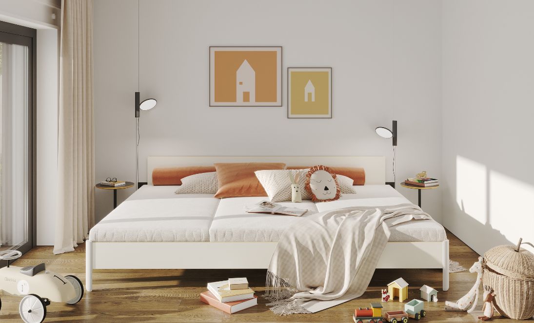 Ein Familienbett bietet ausreichend Platz für Eltern und Kinder, fördert Nähe und sorgt für entspanntere Nächte, da niemand eingeengt schlafen muss.